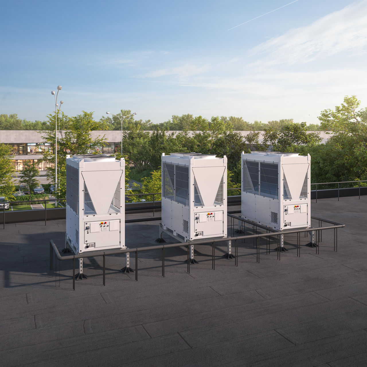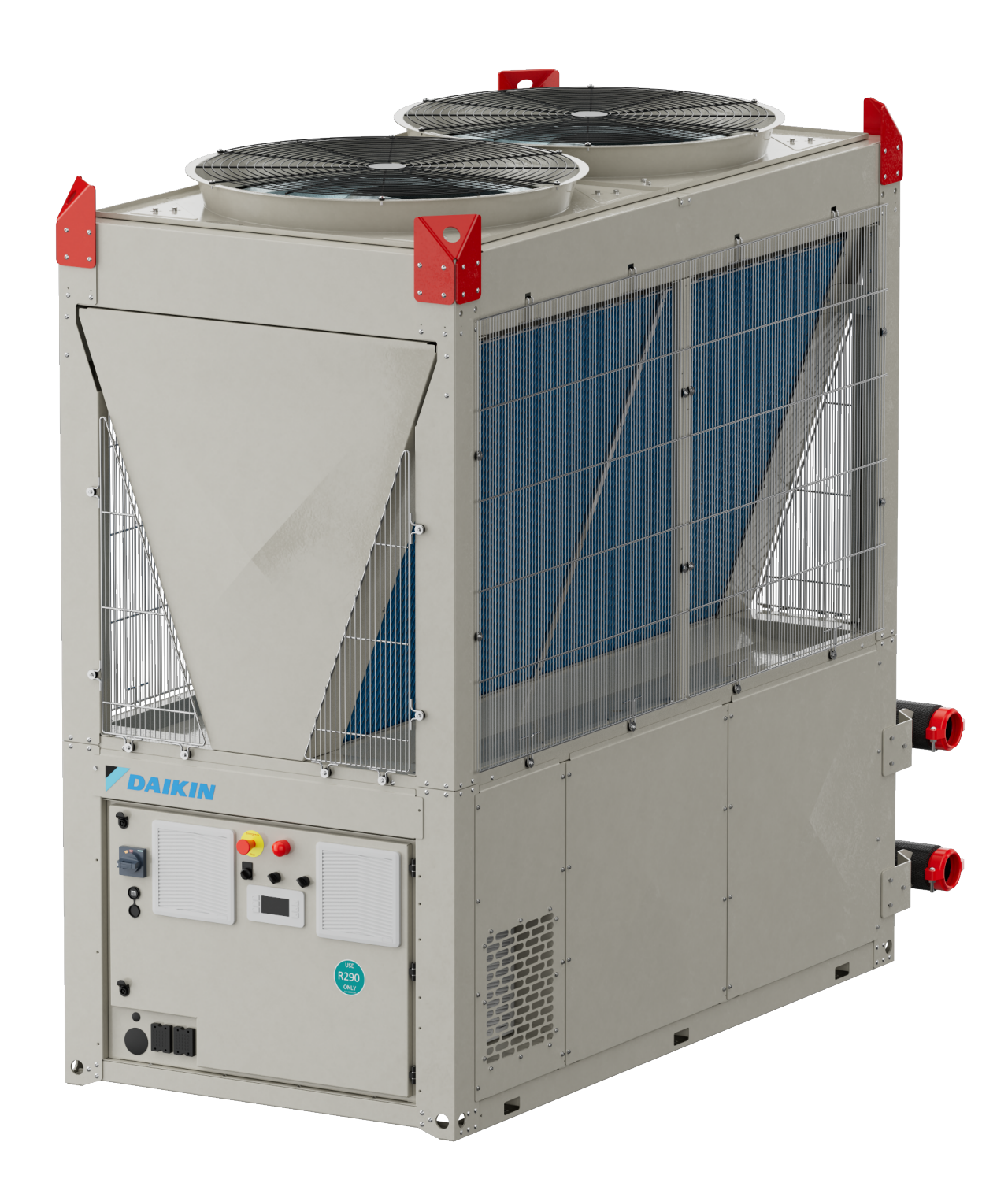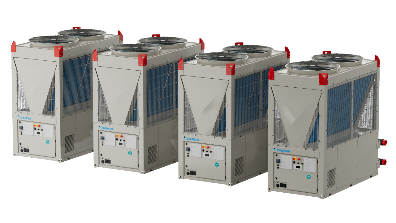 Daikin EWYK-QZ je modularna inverterska dizalica topline zrak-voda koja koristi radnu tvar R-290, projektirana za skaliranje od jednog modula od 135 kW do 2000 kW na više nizova.